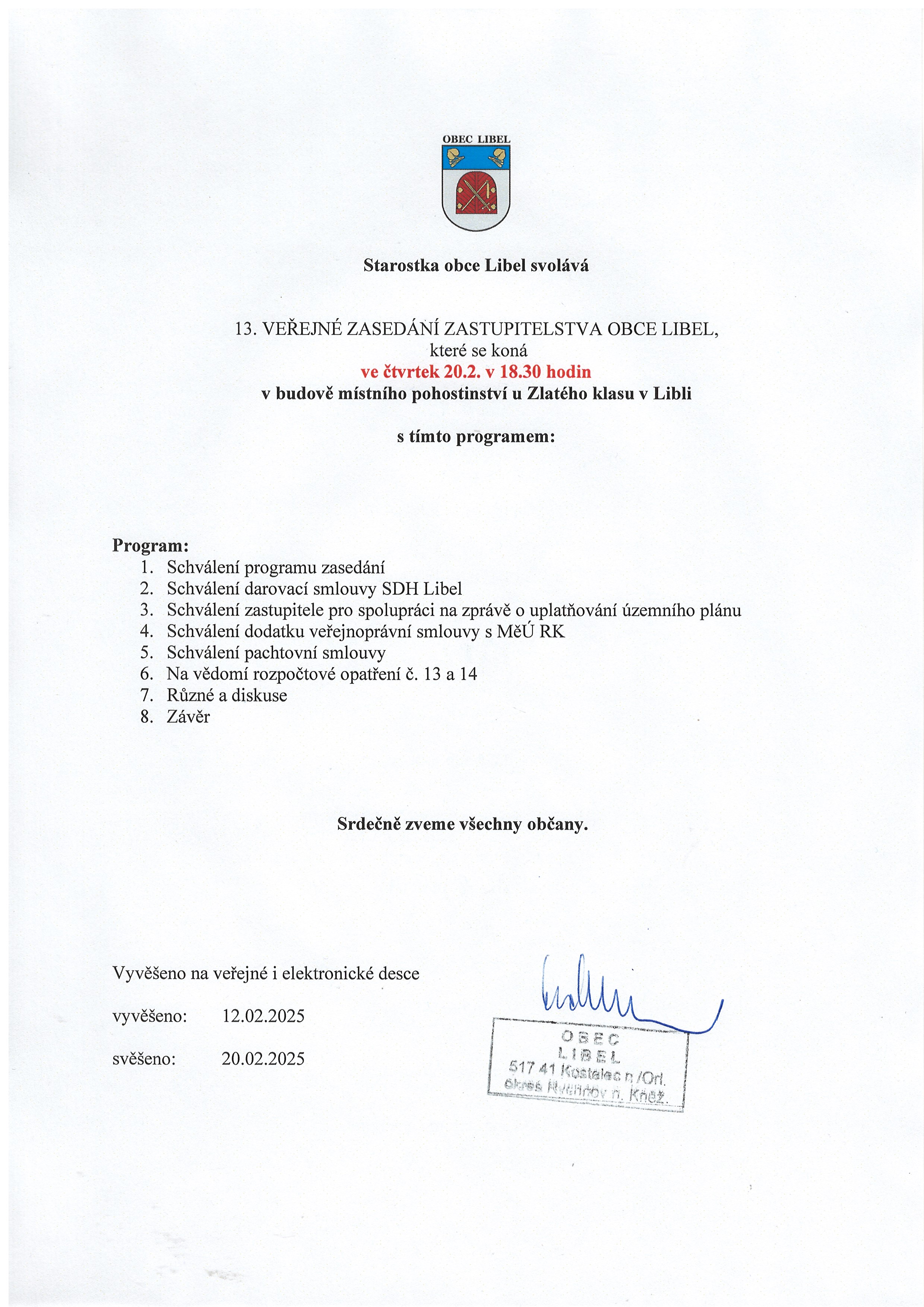 12.02 - 20.02.2025 Pozvánka na 13. veřejné ZO Libel