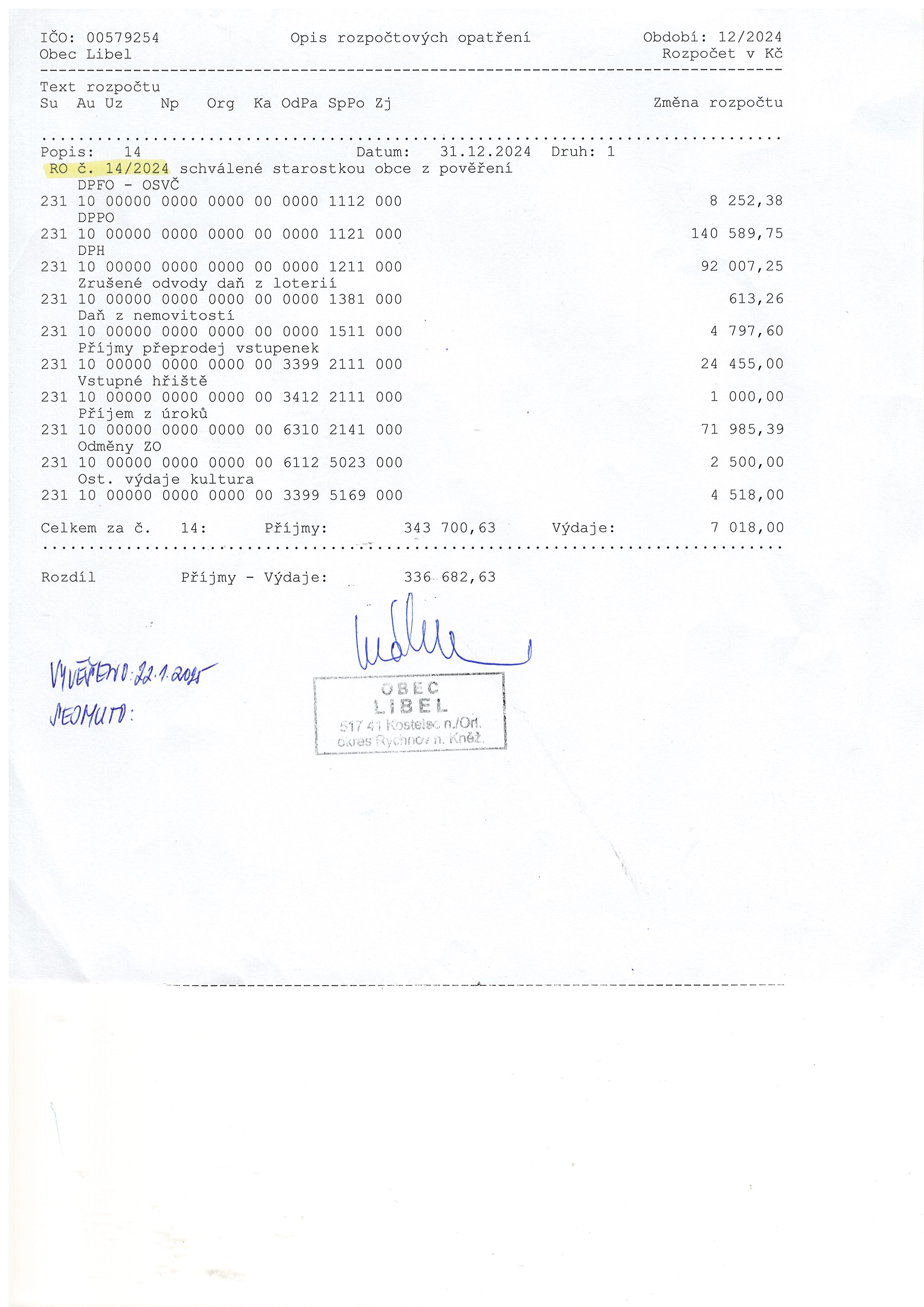 22.01 - 28.02.2025 Rozpočtové opatření č. 14/2024