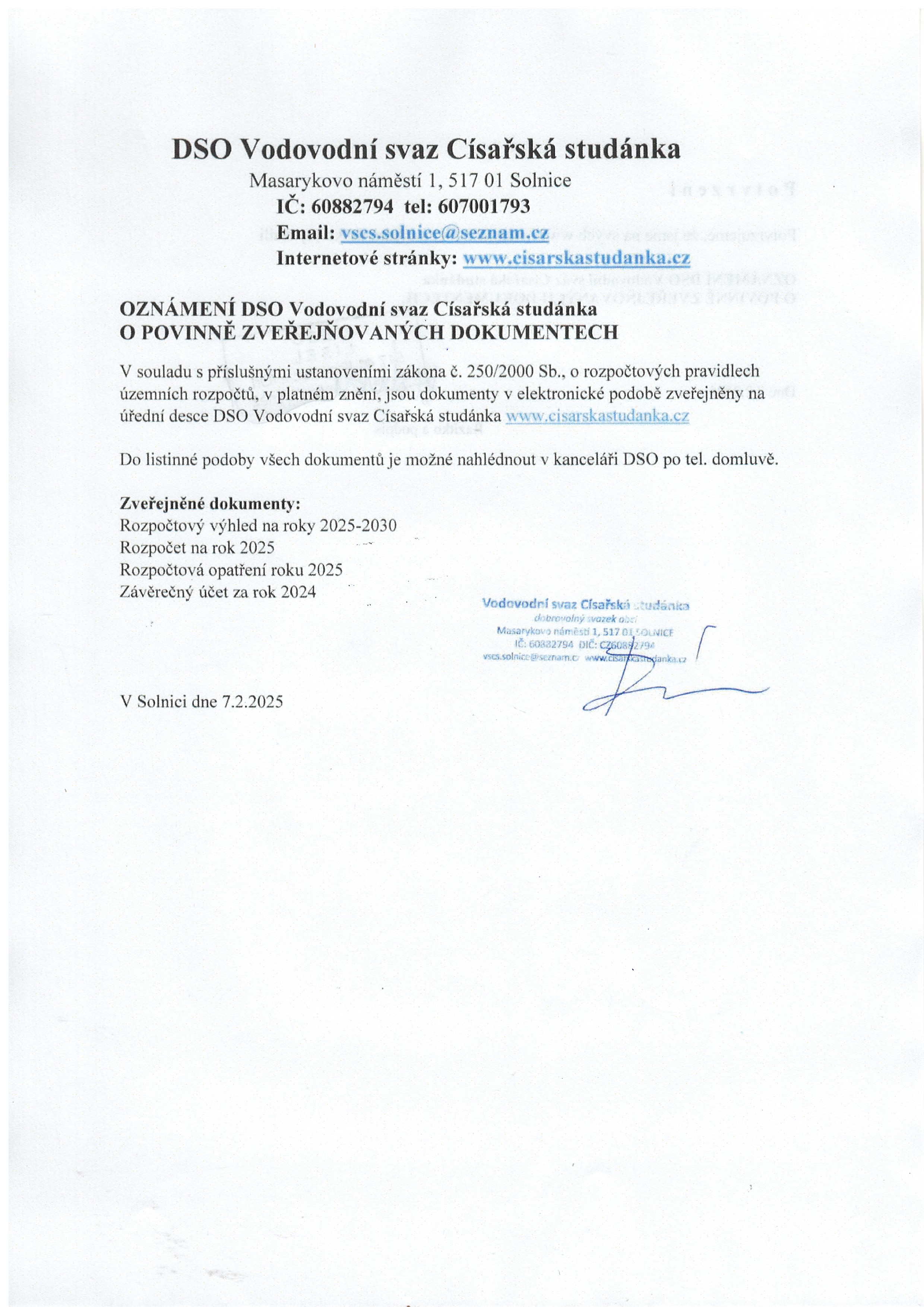 07.02 - 25.02.2025 Oznámení DSO VsCs o povinně zveřejňovaných dokumentech
