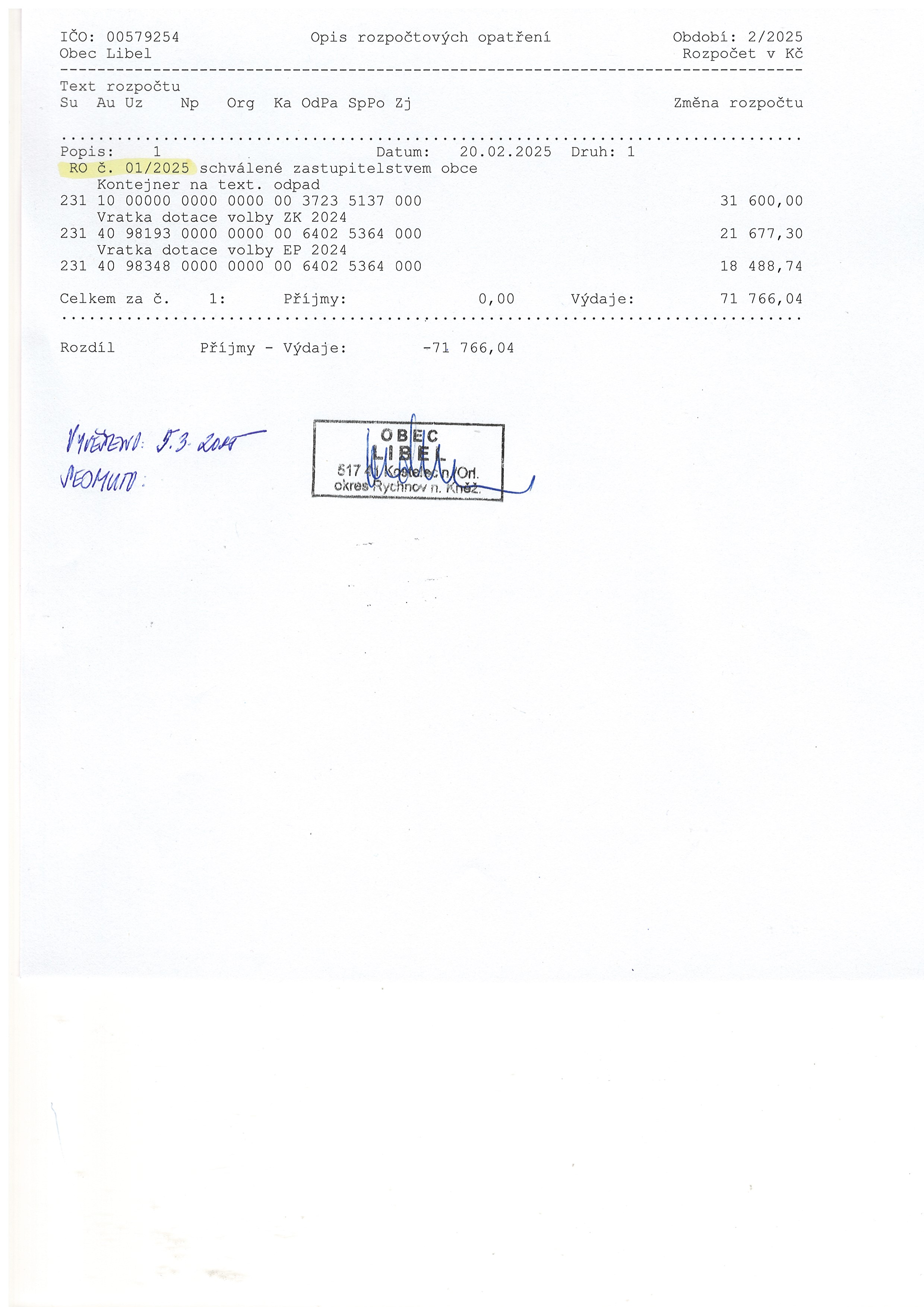 05.03 - 31.12.2025 Rozpočtové opatření č. 1