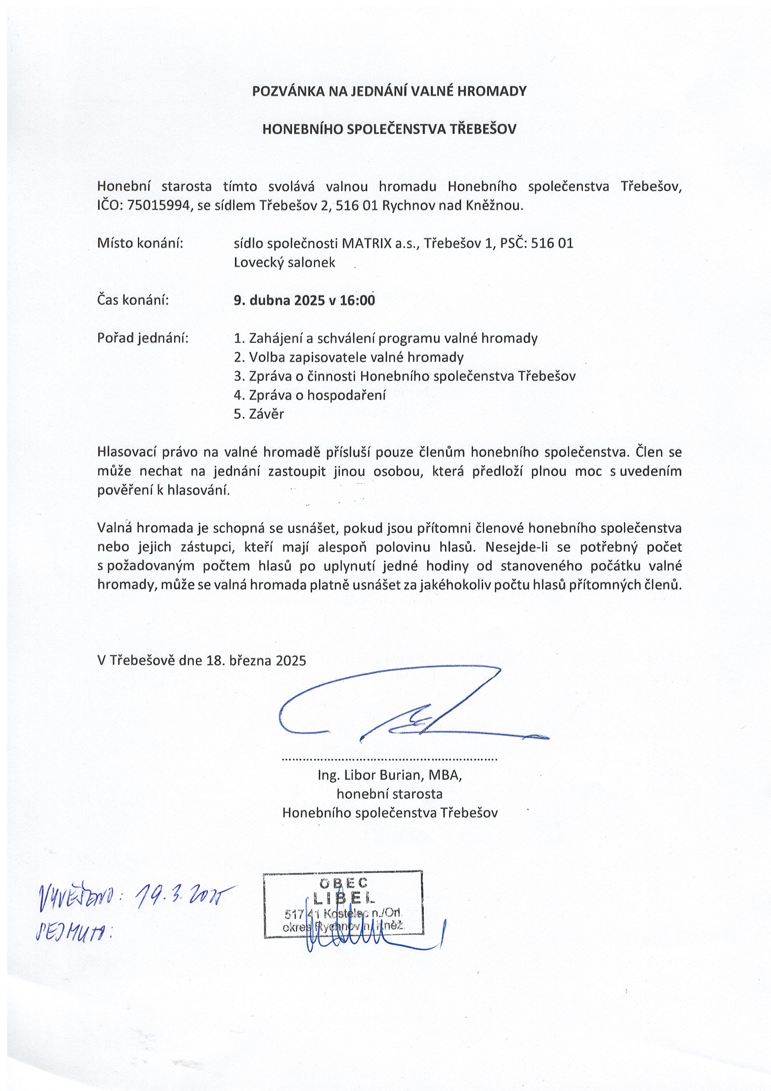 19.03 - 19.04.2025 Pozvánka na jednání valné hromady honebního společenstva Třebešov