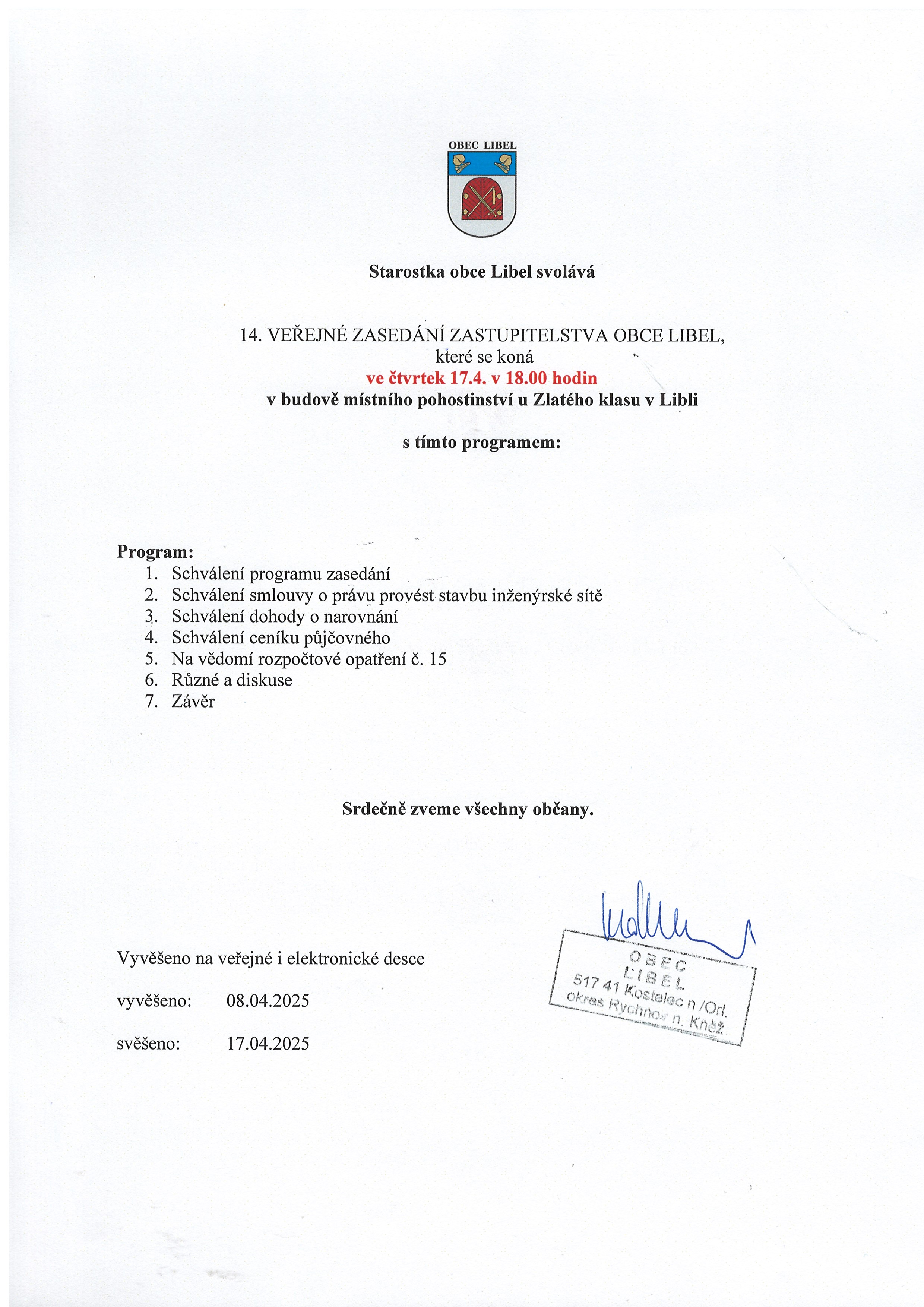08.04 - 17.04.2025 Pozvánka na 14. veřejné zasedání ZO Libel
