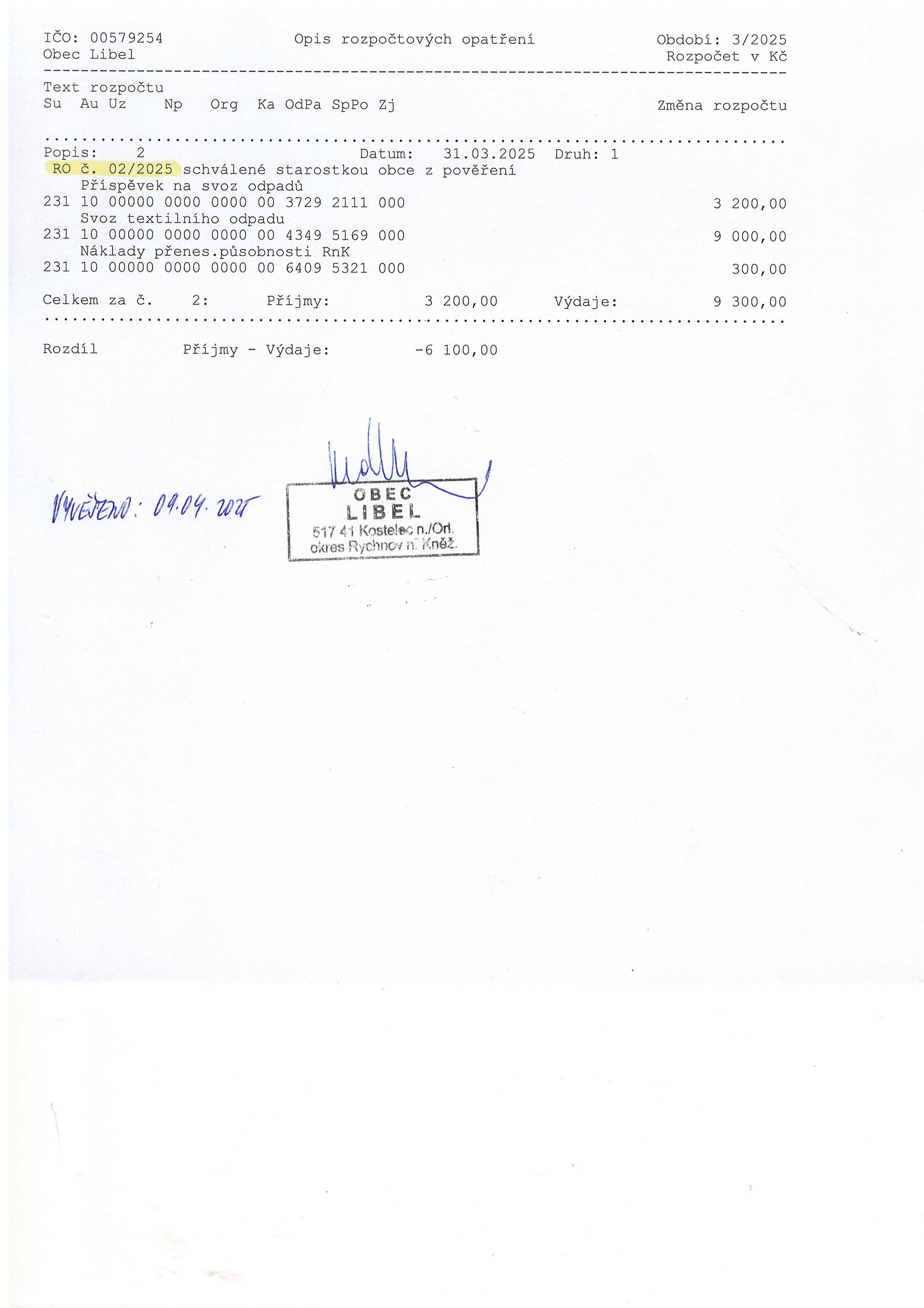 09.04 - 31.12.2025 Rozpočtové opatření č. 2