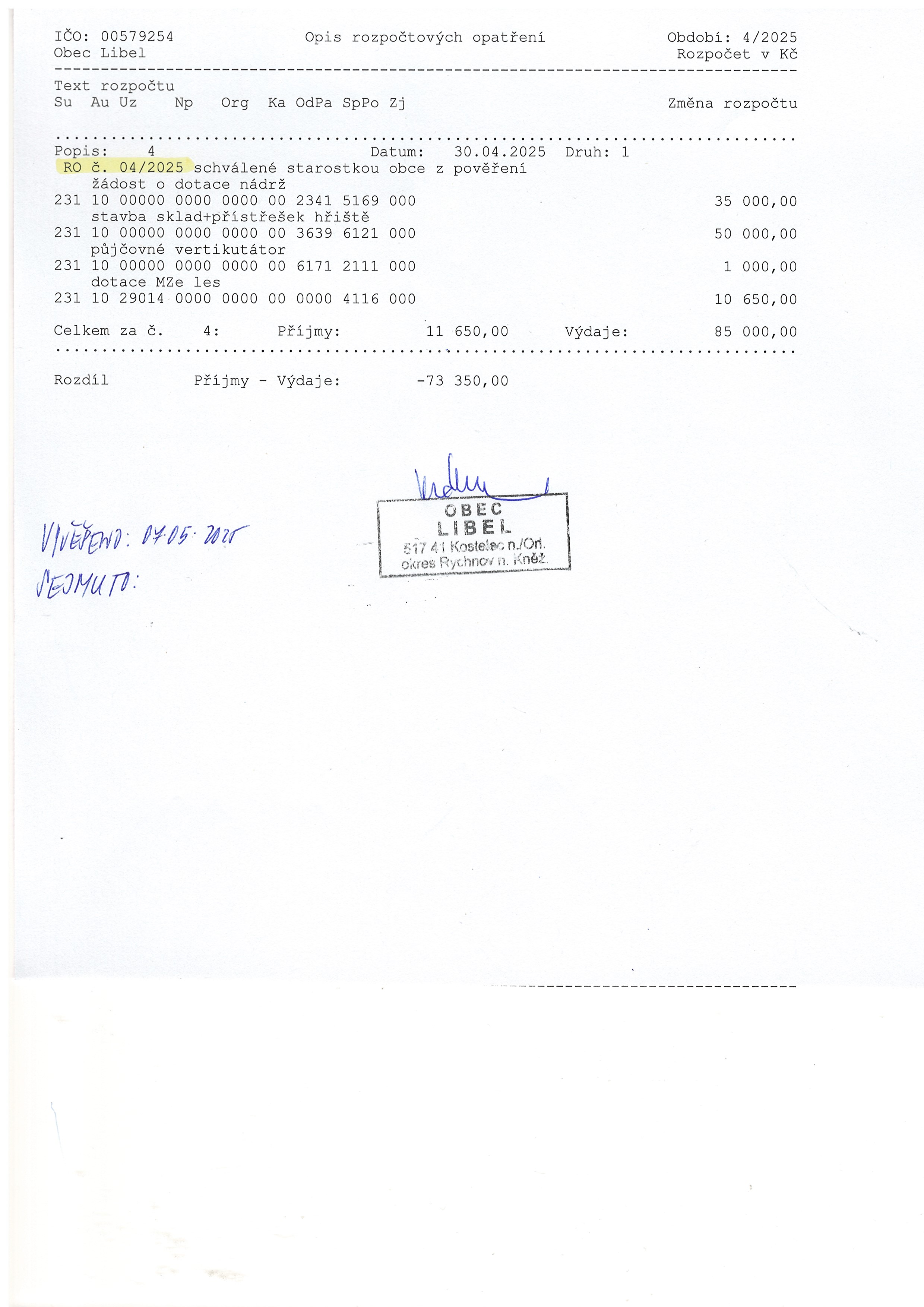 07.05 - 31.12.2025 Rozpočtové opatření č.4