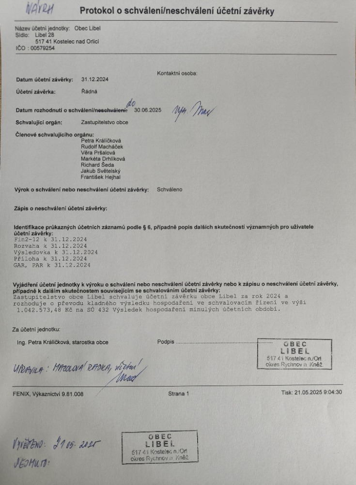 21.05 - 30.06.2025 Návrh účetní závěrky obce Libel za r.2024 včetně příloh. pdf 65 kB