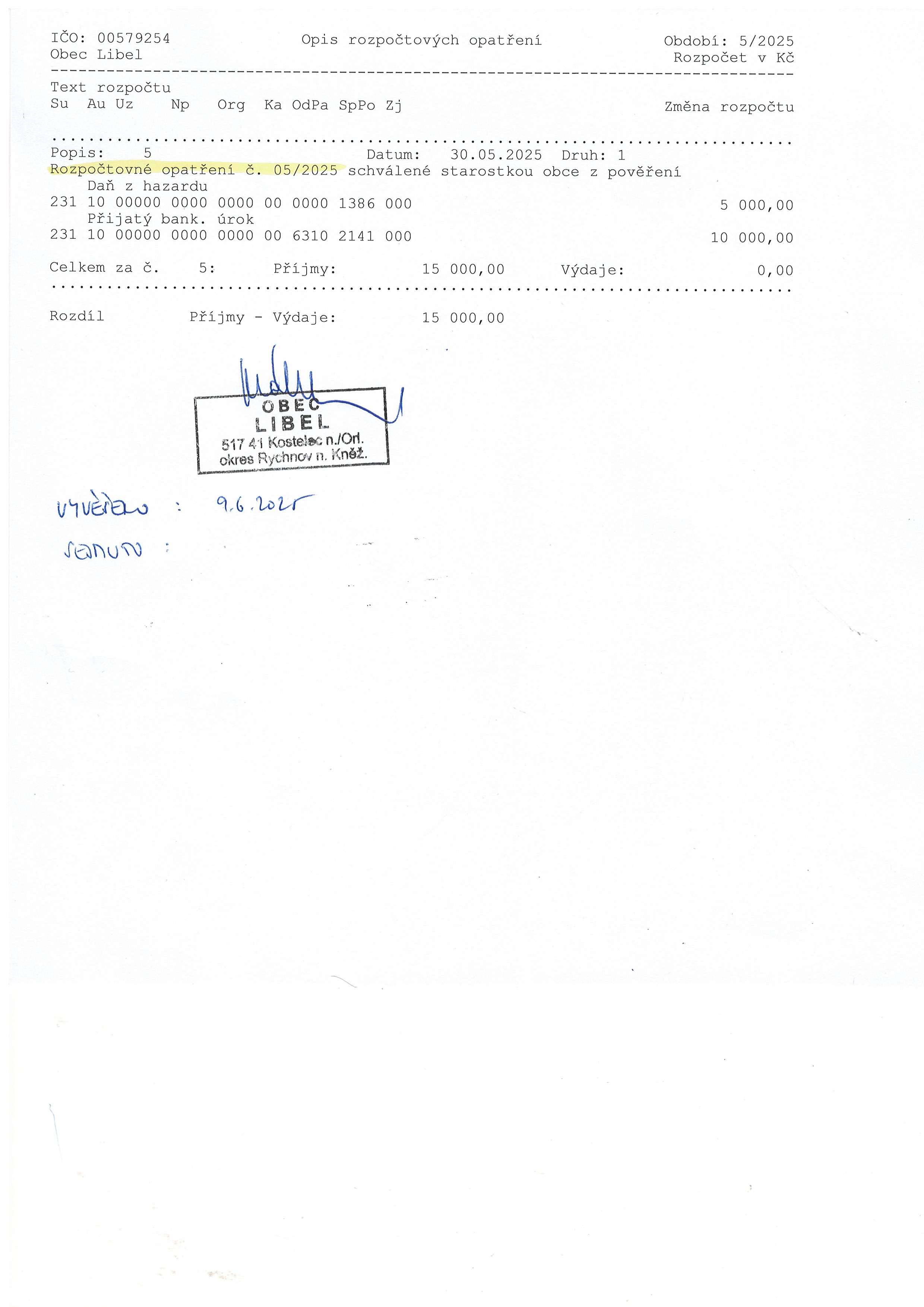 09.06 - 31.12.2025 Rozpočtové opatření č. 5