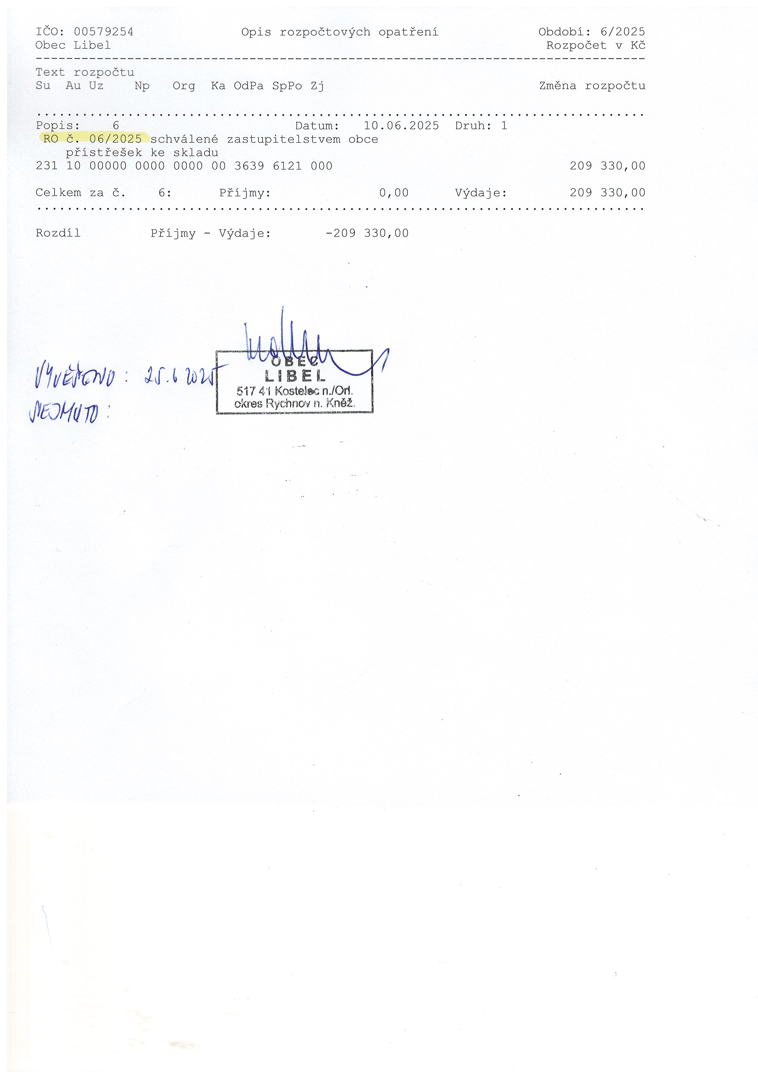25.06 - 31.12.2025 Rozpočtové opatření č. 6