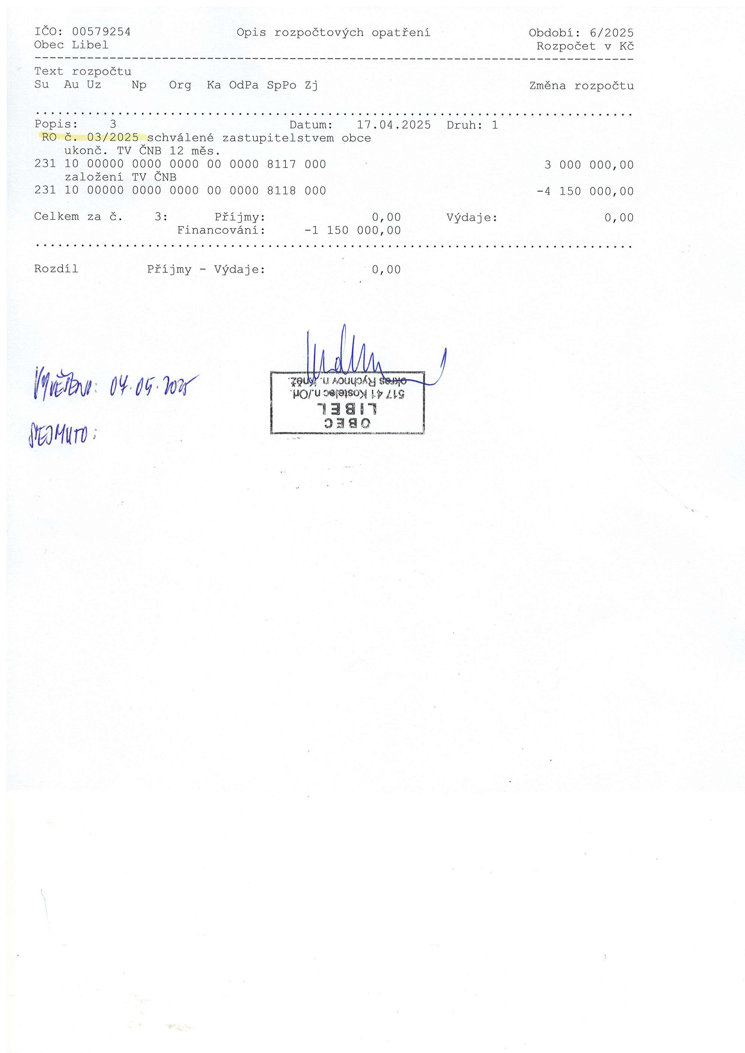 07.05 - 31.12.2025 Rozpočtové opatření č. 3