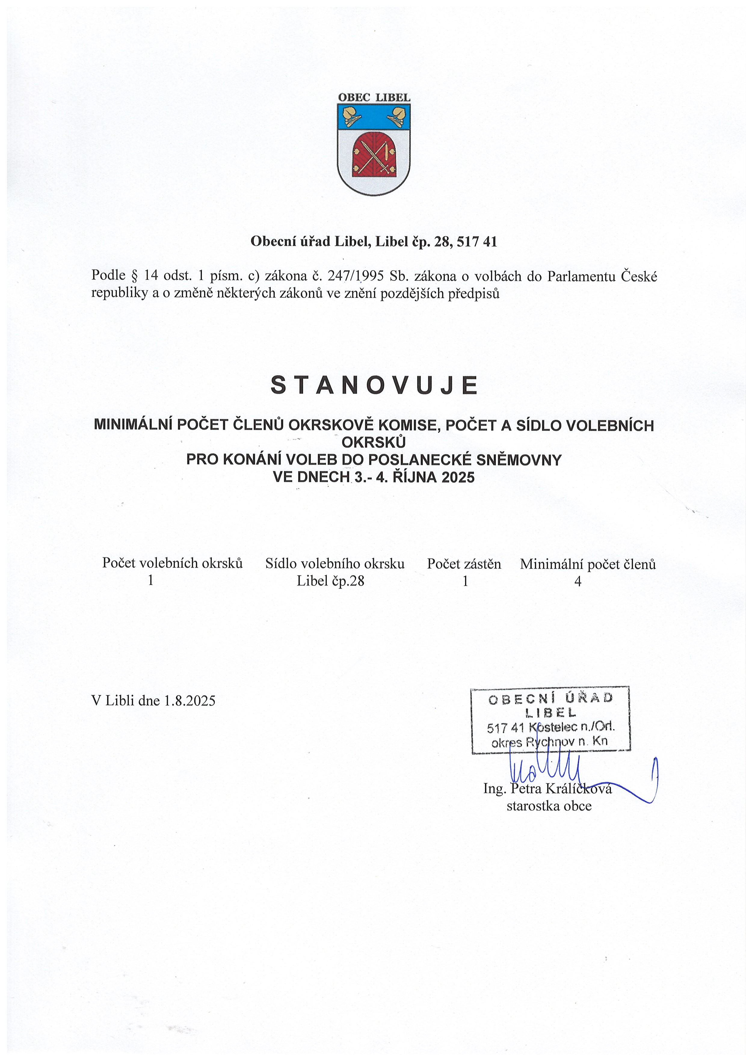 17.09 - 04.10.2025 Oznámení o době a místě konání voleb v Libli