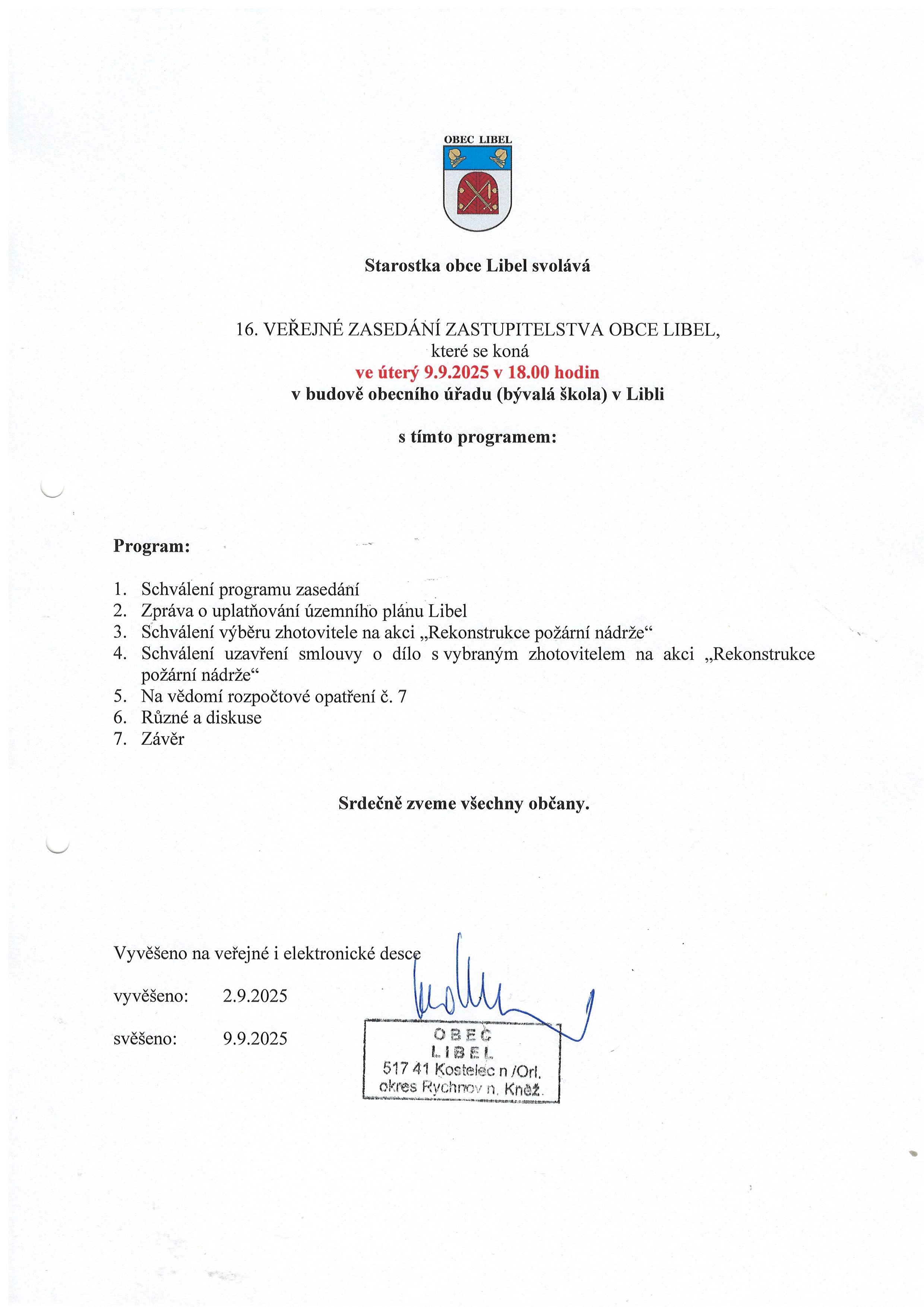 01.09 - 09.09.2025 Pozvánka na 16. veřejné zasedání ZO Libel