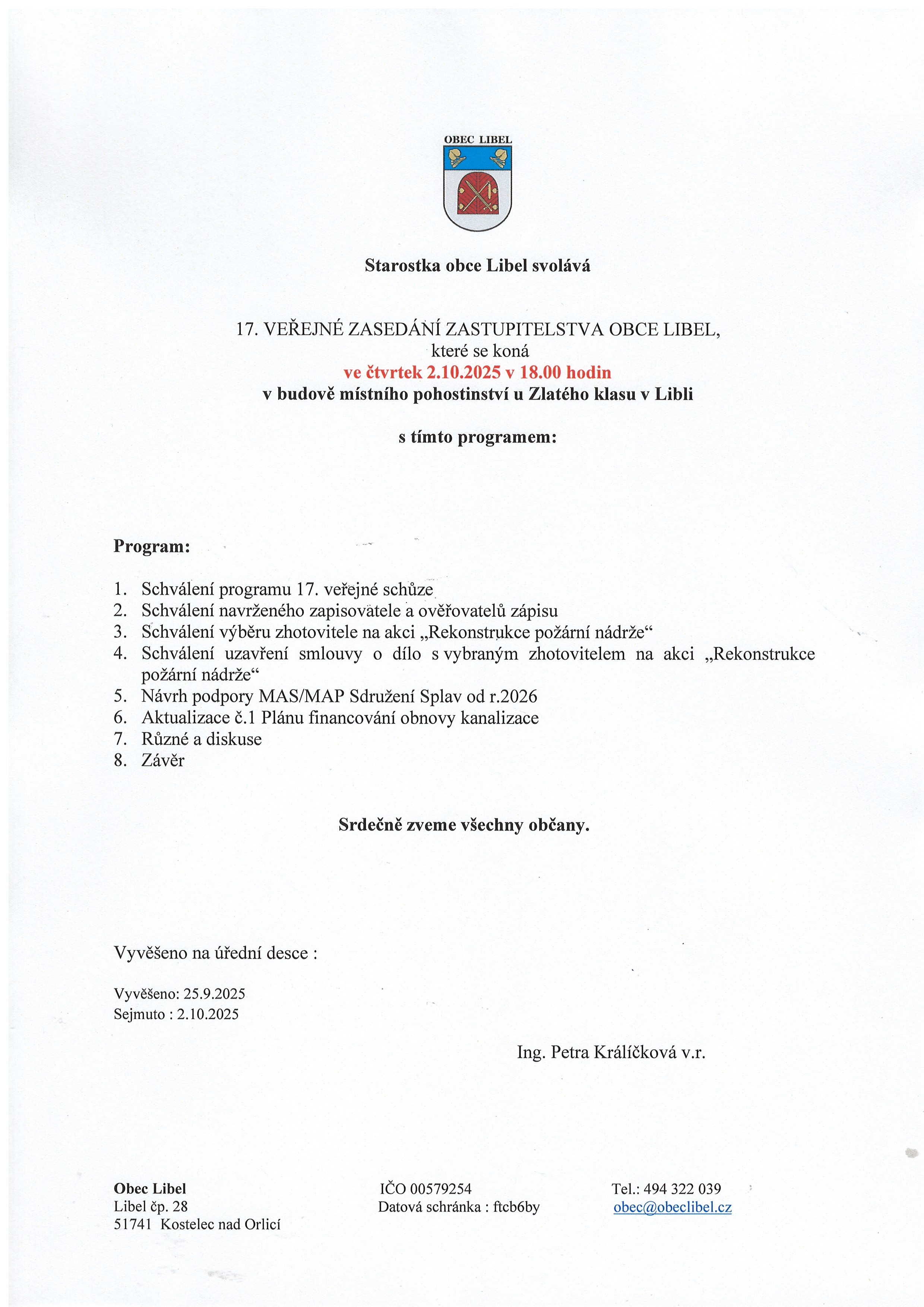 25.09 - 02.10.2025 Pozvánka na 17. veřejné zasedání ZO Libel