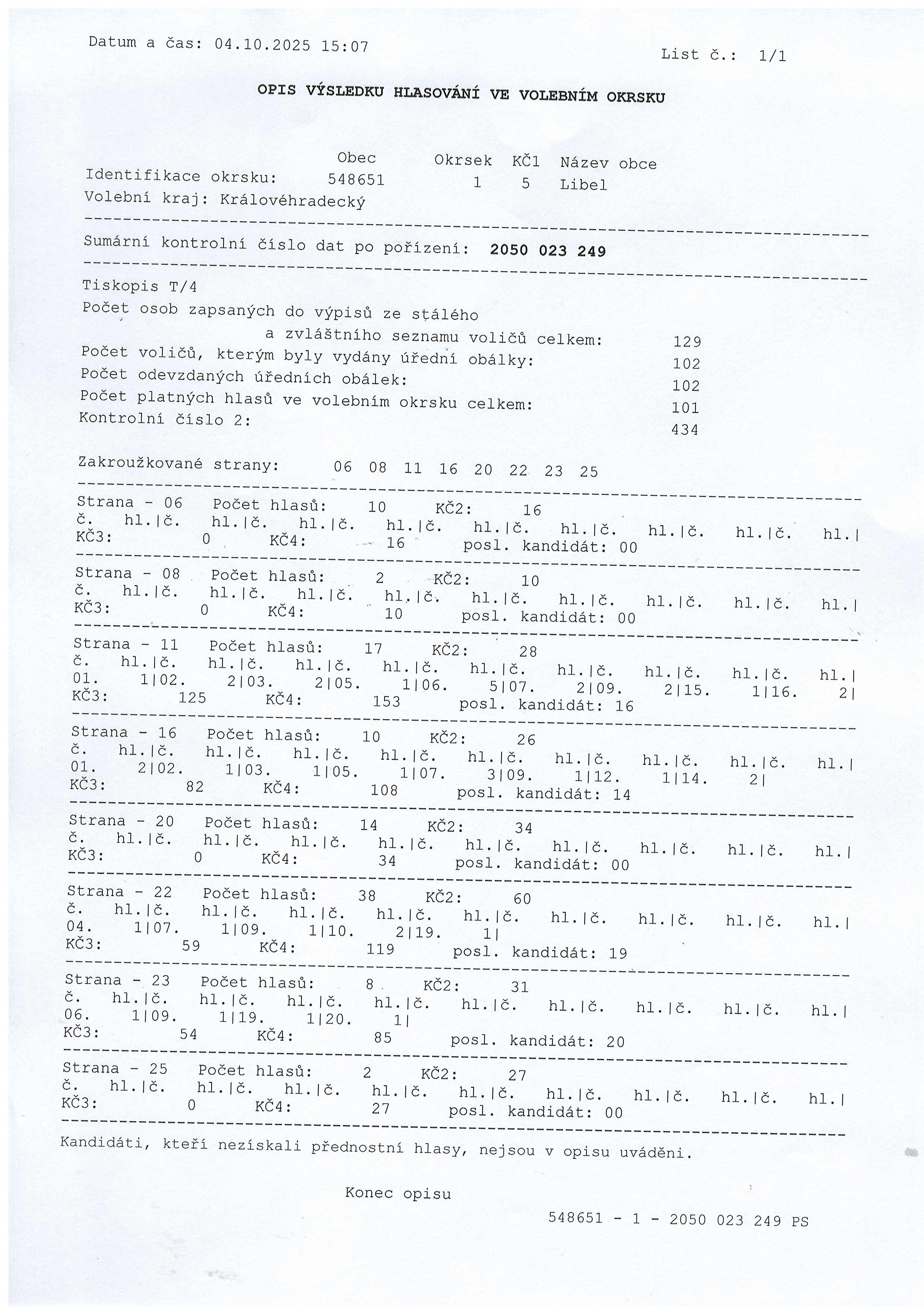 04.10 - 31.10.2025 Opis výsledku hlasování ve volebním okrsku v Libli - volby do PS 3.-4.10.2025
