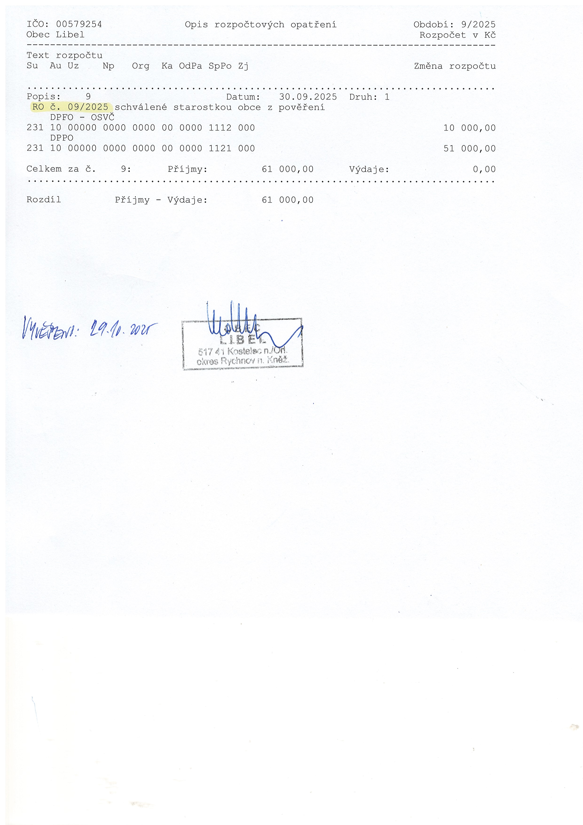 29.10 - 31.12.2025 Rozpočtové opatření č. 9