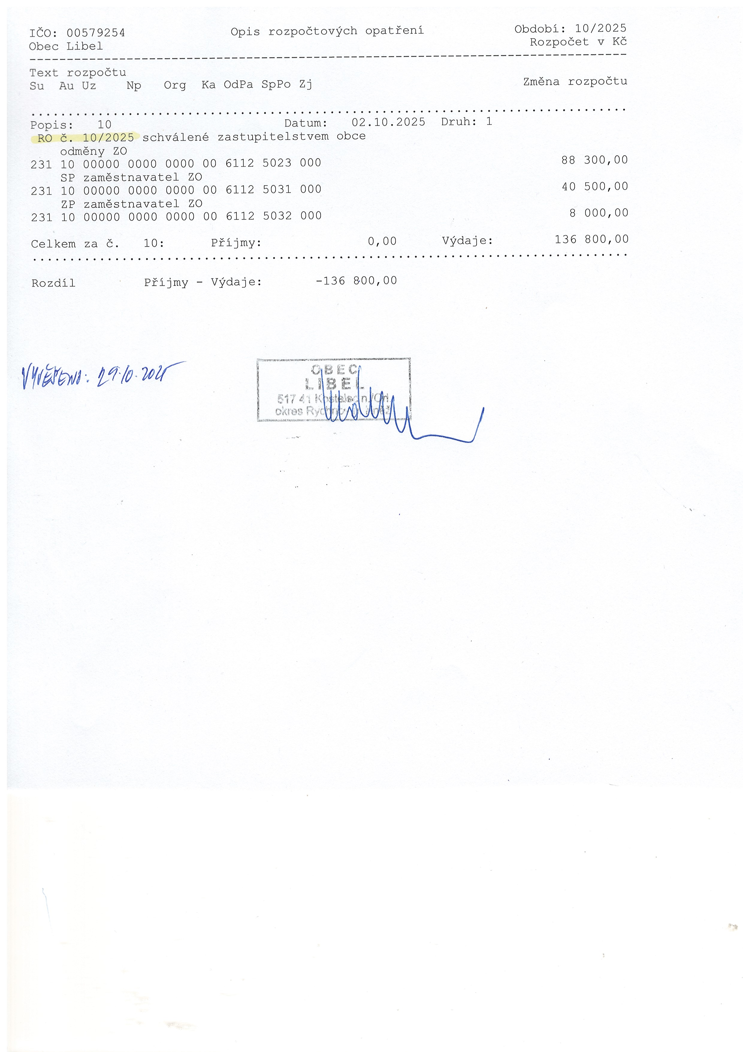 29.10 - 31.12.2025 Rozpočtové opatření č.10