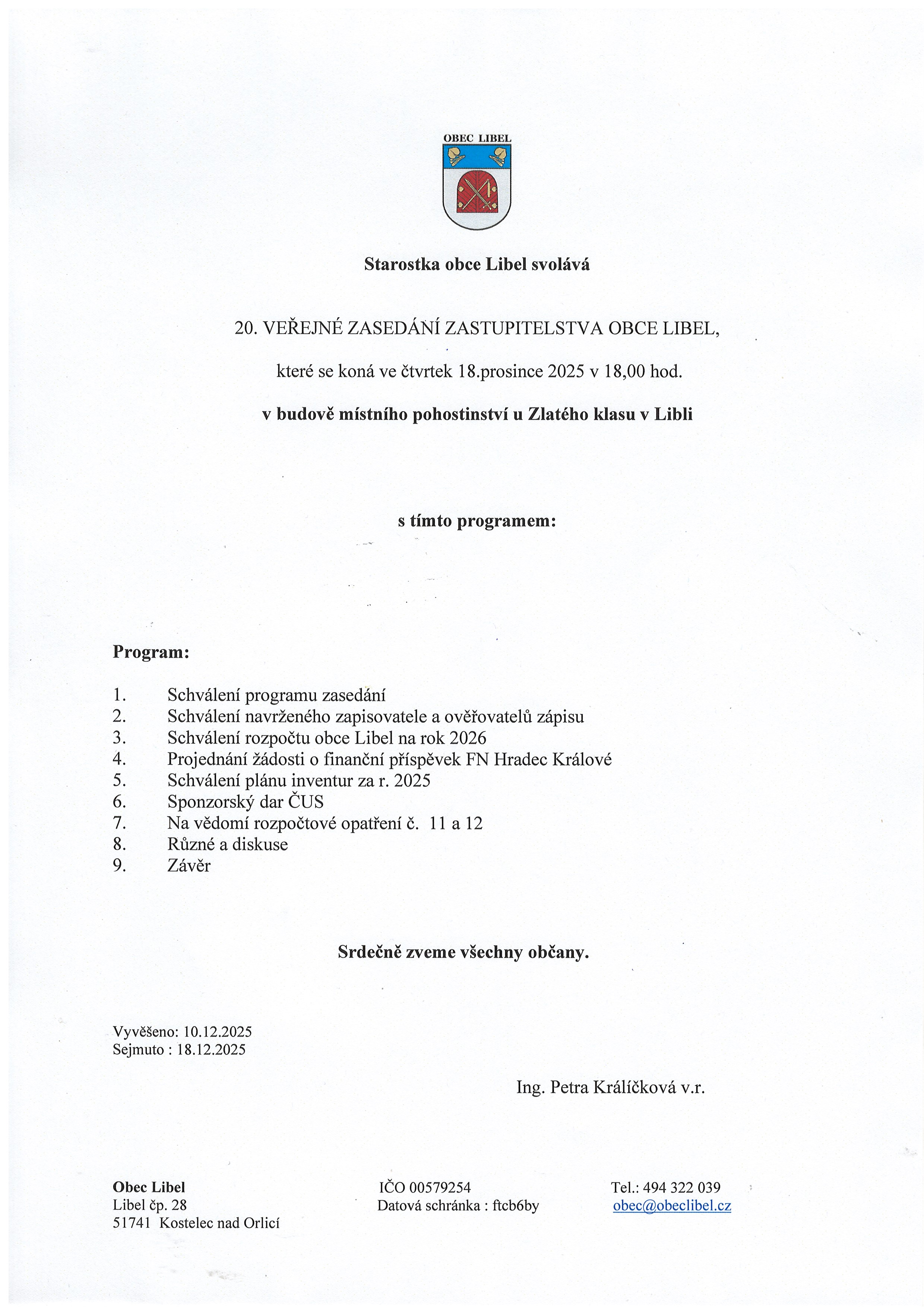 10.12 - 18.12.2025 Pozvánka na 20. veřejné zasedání ZO Libel