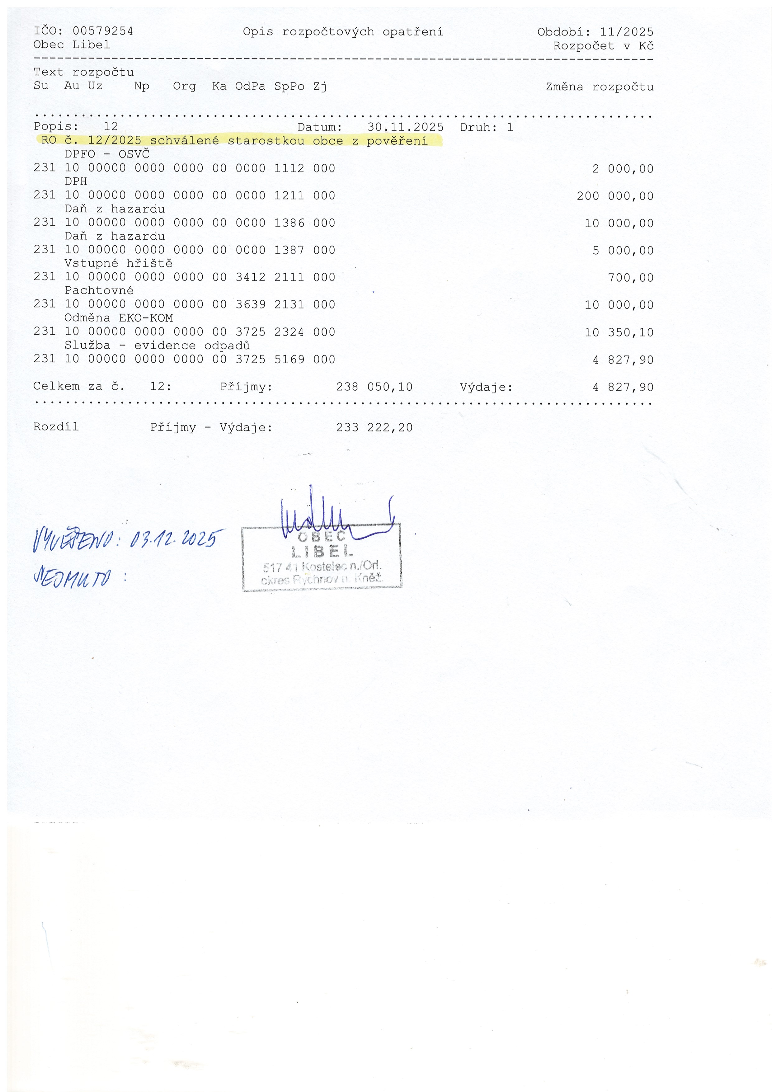 03.12 - 31.12.2025 Rozpočtové opatření č. 12